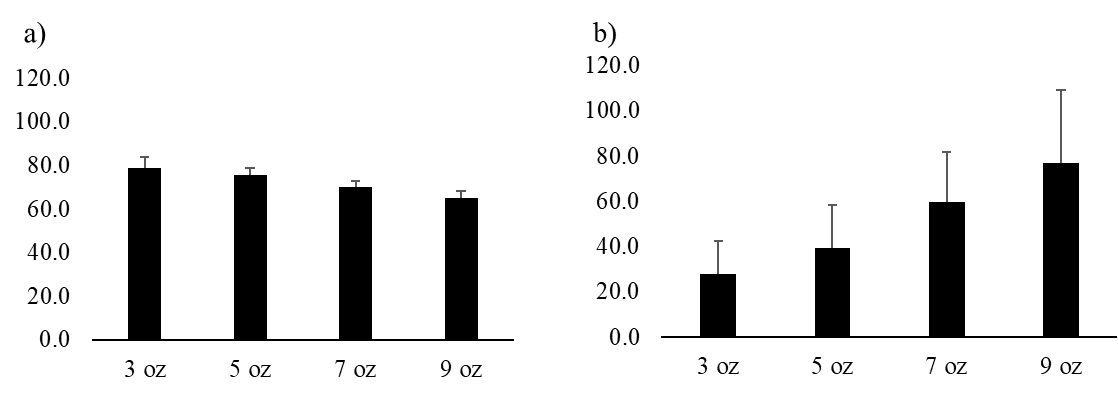 Mientras que los valores de fuerza son 76.7 ± 32.58 para la pelota de 9 oz, 59.5 ± 22.11 para la pelota de 7 oz, 39.6 ± 18.96 para la pelota reglamentaria y 28 ± 14.35 para la pelota de 3 oz (Cuadro 1).