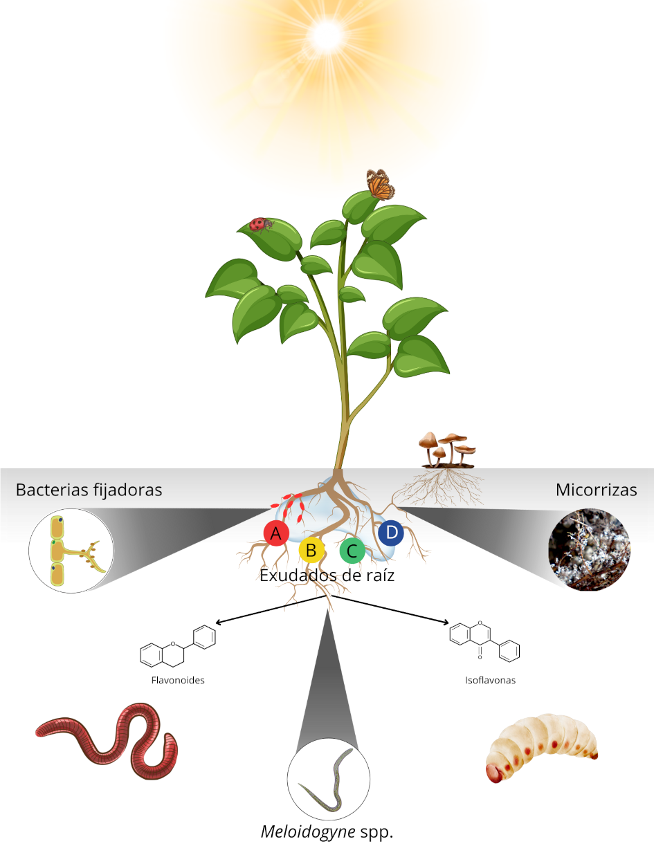 Un caso puntual de señalización radical son las isoflavonas de la soya (Glycine max L.), que atraen tanto a bacterias fijadoras de nitrógeno (Bradyrhizobium japonicum; Castro-Barquero, 2024), como a Phytophthora sojae ─un oomiceto patógeno (López-Cardona y López-Casalla, 2018), lo que evidencia la doble naturaleza de ciertos compuestos químicos. Este tipo de interacciones ilustra como los exudados radicales pueden fomentar relaciones mutualistas o facilitar el ataque de patógenos en la rizósfera (De-la-Peña y Loyola-Vargas, 2014; Zhang et al., 2020).