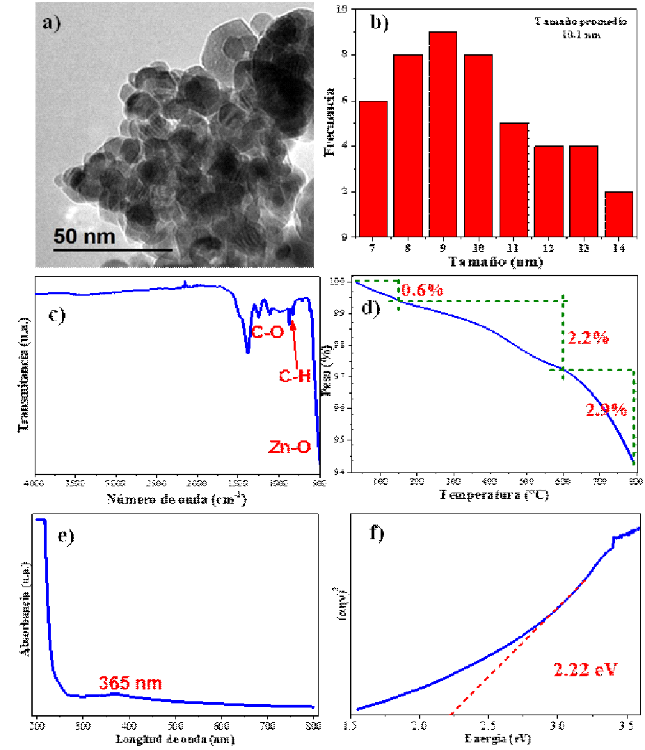 Figura 3. Caracterización de NPs de ZnO. a) Análisis de TEM, b) distribución de tamaños, c) análisis FT-IR, d) análisis TGA, e) análisis UV-Vis y f) cálculo de Band gap.