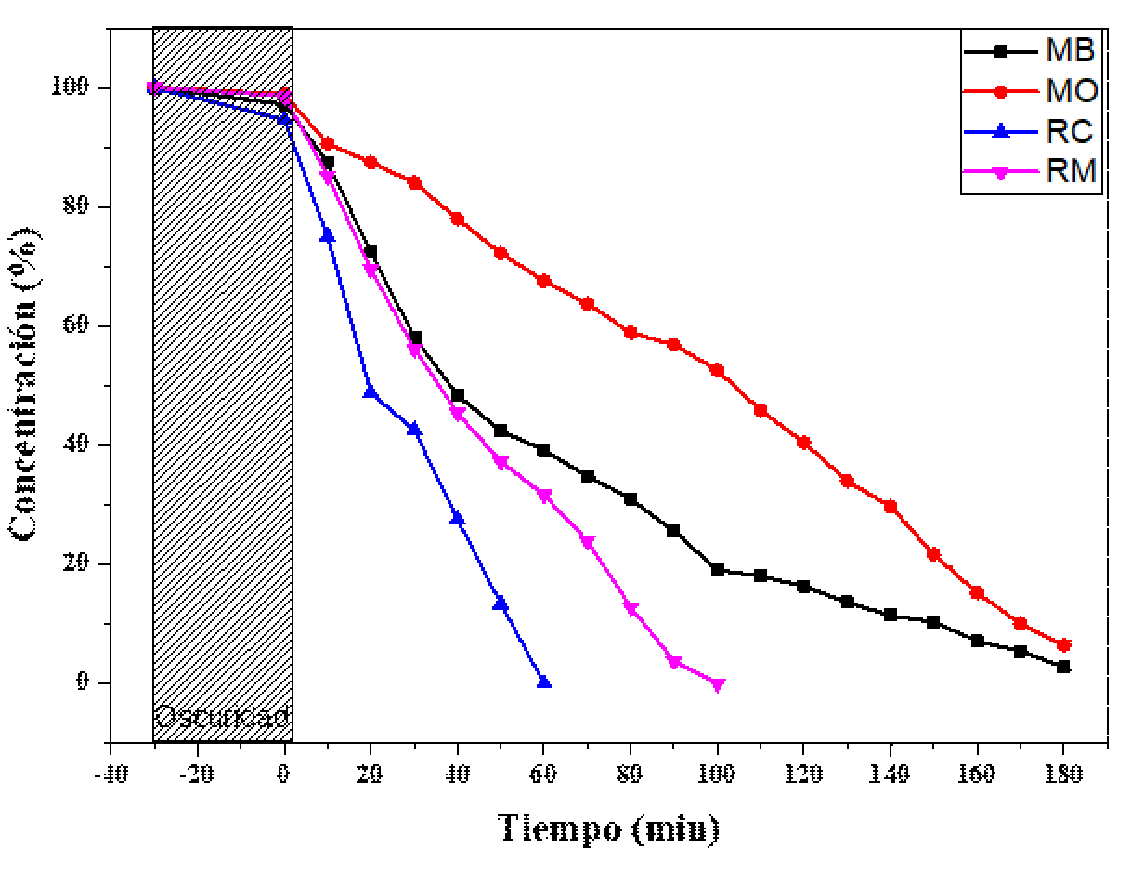 La actividad fotocatalítica de las NPs de ZnO sintetizadas con extractos de L. alba al 4% fue evaluada midiendo la degradación de cuatro colorantes orgánicos MB, MO, RC y RM bajo radiación ultravioleta. Se prepararon soluciones contaminadas de estos colorantes con una concentración de 15 mg/L y se agregaron 50 mg del fotocatalizador (NPs de ZnO) en 50 ml de la solución contaminada. Posteriormente, la solución fue agitada (aproximadamente 1000 rpm) durante 30 min en la oscuridad para asegurar un equilibrio de adsorción-desorción. Luego, la solución se colocó en reactores de luz ultravioleta marca UV Polaris Scientific modelo UVA-2C. Por último, una vez encendida las lámparas se tomó una muestra cada 10 min durante tres horas consecutivas (180 minutos). Posteriormente, las muestras fueron evaluadas por espectroscopia de UV-Vis para evaluar su concentración y el porcentaje de degradación.