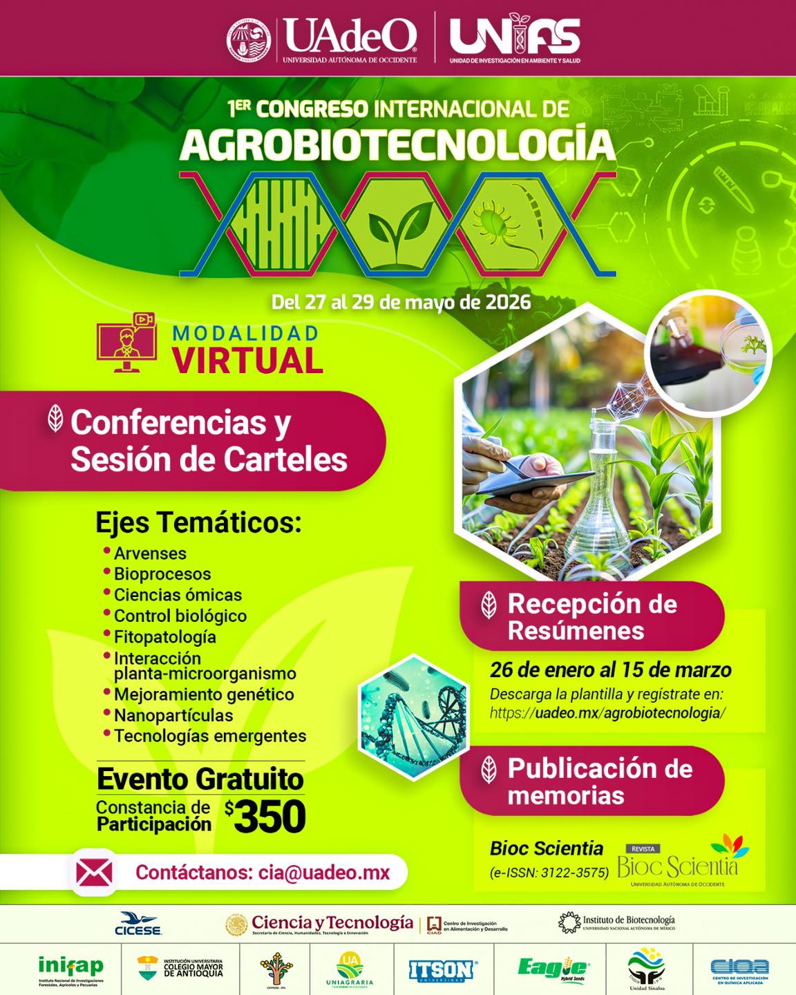 Las memorias del 1er Congreso Internacional de Agrobiotecnología serán publicadas en la revista Bioc Scientia. El evento se realizará en modalidad virtual del 27 al 29 de mayo de 2026 y convoca contribuciones en áreas clave de la agrobiotecnología.